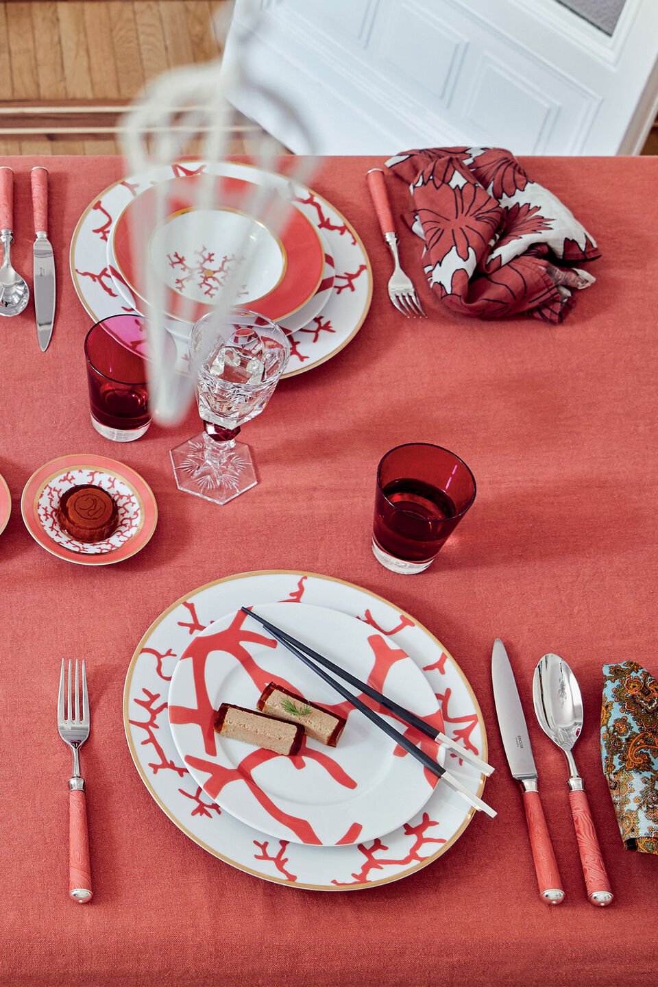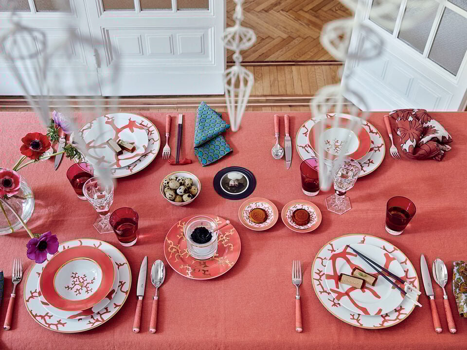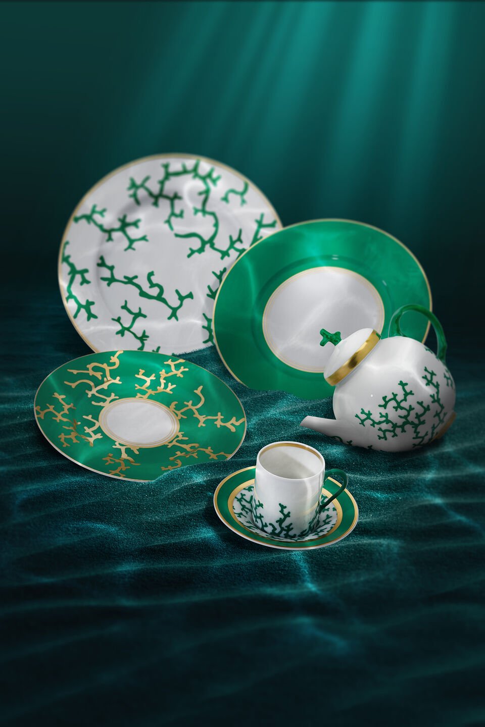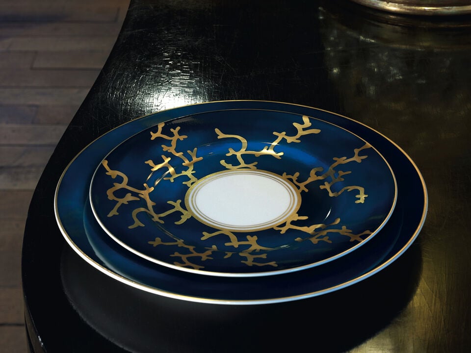 Designed by Alberto Pinto for Raynaud, Cristobal features coral motifs in emerald green, coral red, and ultramarine blue, reflecting the mysterious sea depths.