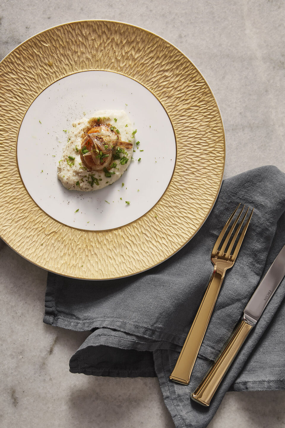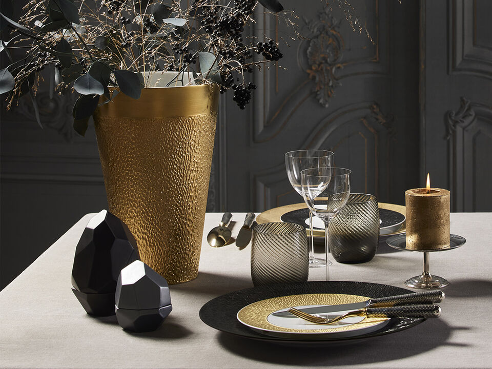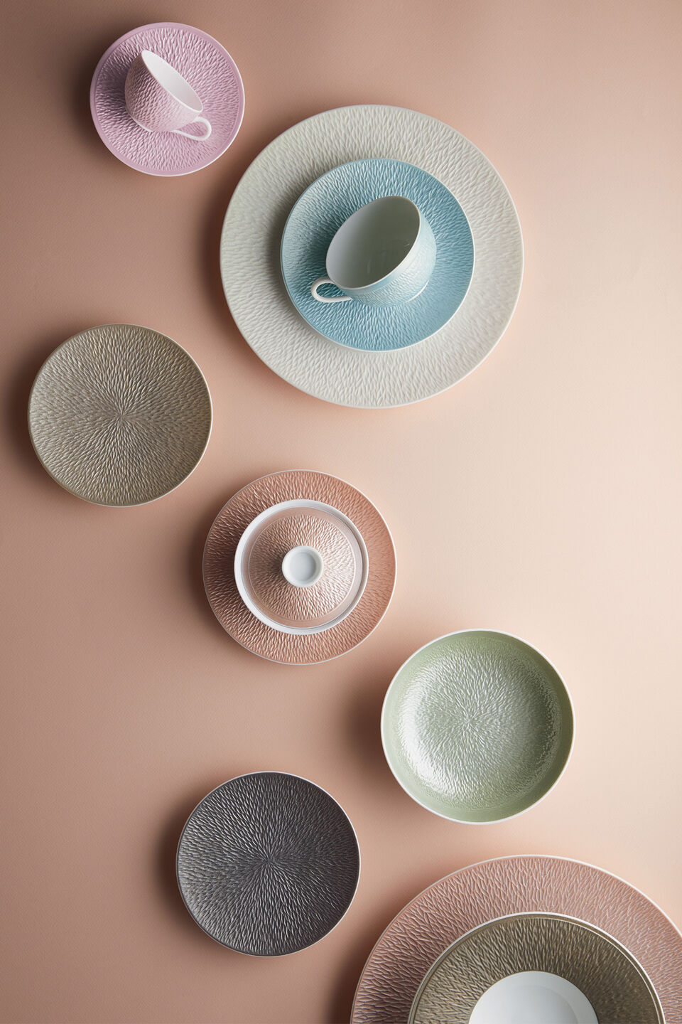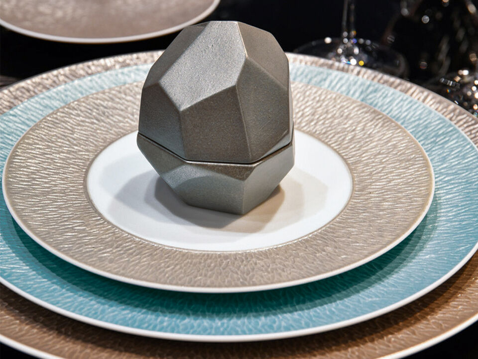 Designed by Thierry Cheyrou, Raynaud's Minéral Irisé features precise reliefs inspired by nature, available in gold, platinum, and earthy hues, with a shimmering glaze.