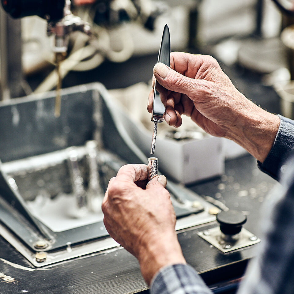 The handle and the blade of a knife are manufactured separately during the first steps. Their assembly requires precision and patience.