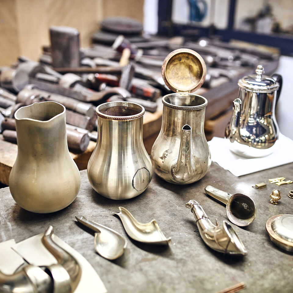 A large number of parts make up a piece of silverware such as a teapot or a jardinière. Each part of a piece is prepared separately before assembly by the silversmith. Some parts (such as the spout of a coffee pot) are made from stamped bodies, which are pressed out as for cutlery. Others, such as baby cup or certain trays, are shaped directly on the turning and embossing workshop by the chiseller silversmith. The decorative elements such as the buttons on the lids, the handles, etc. are made in cast bronze by the art caster, from moulds which themselves come from an original model engraved and chiselled by the engraver. Finally, the silversmith assembles the various elements that will make up the final piece. All assembly methods must be carried out with great care to be both solid and invisible.
