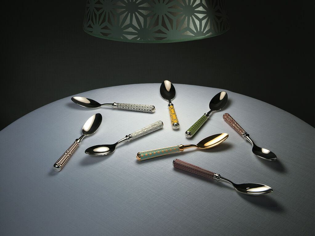 Ercuis innovates by creating a made-to-measure cutlery: Arts Décoratifs. With its colourful patterns, the cutlery has a new personality. 9 designs are to be combined with a coloured laquer to be chosen among 30 shades. A range of choices for every taste, every style and every imagination