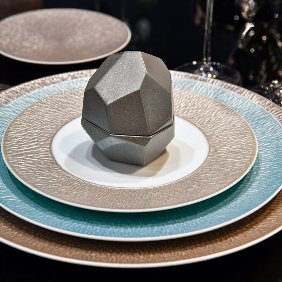 Combine matt finishes with glossy details for a table full of character. Engraved porcelain creations such as Minéral or Italian Renaissance create a subtle contrast with the other collections in the Maison Raynaud catalogue.