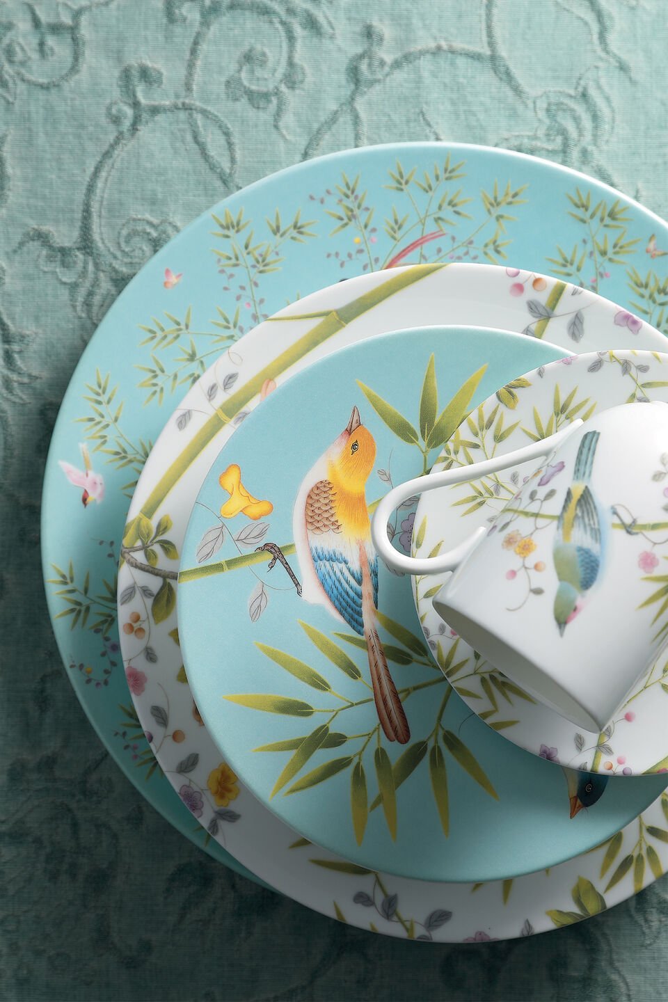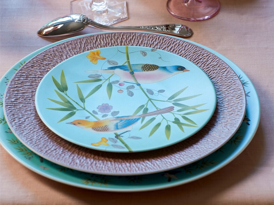 Raynaud's Paradis, in collaboration with Fromental, features Chinoiserie patterns with butterflies and birds of paradise, inspired by exotic nature and luxurious wallpaper designs.