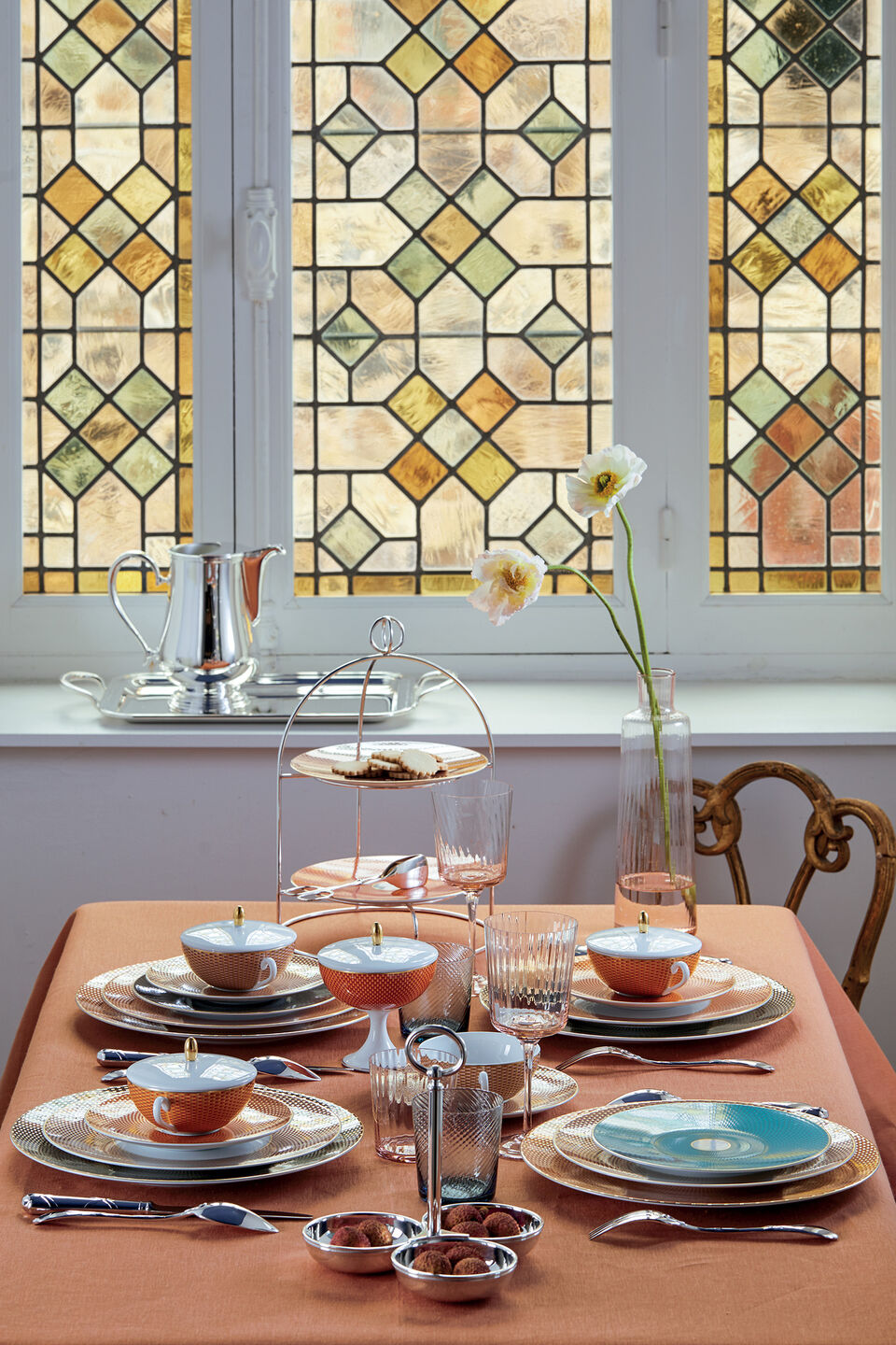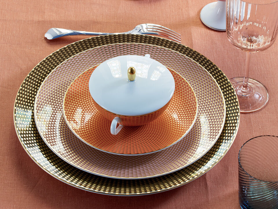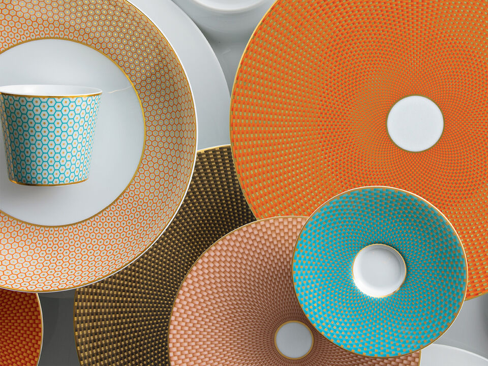 Raynaud's Trésor offers three patterns in four colors, inspired by sari fabrics and Indian tapestries, with a mix of soft beige, chestnut, turquoise, and orange adorned with gold highlights.